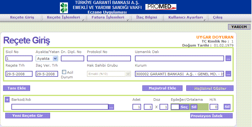 karşınıza reçete giriş ekranı gelecektir.