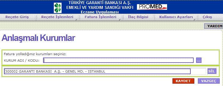 * Anlaşmalı kurum listenizi bir kez tanımlamanız yeterli olacaktır. Reçete Giriş, Fatura Paketi vb. işlemlerinizi yaparken her zaman karşınıza tanımladığınız bu liste gelecektir.